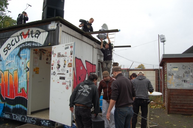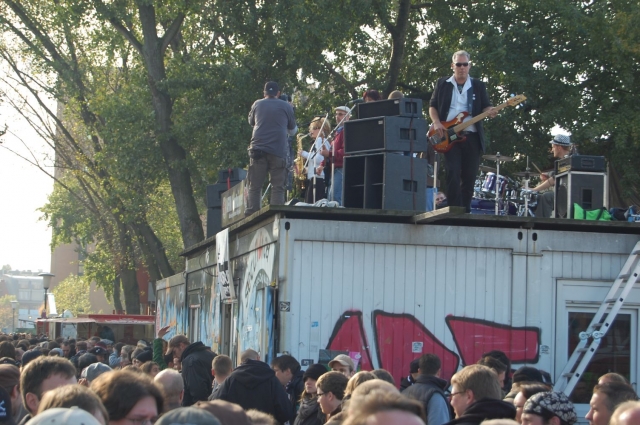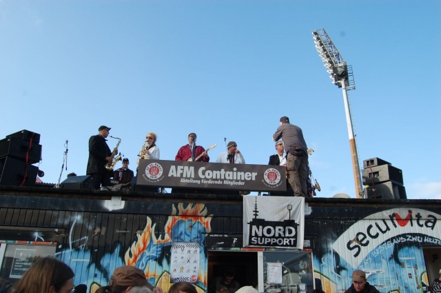 Es hat geklappt! Trotz eher negativer Vorhersagen, hat das Wetter gehalten - die Sicherungen auch. Keiner ist ausgerutscht und vom Dach gefallen. Es war einfach herrlich. Eine Stunde lang haben beim Heimspiel gegen Cottbus SKOP vom AFM-Container aus ihr Bestes gegeben und den Anwesenden edelsten Ska in die Ohren gejagt.